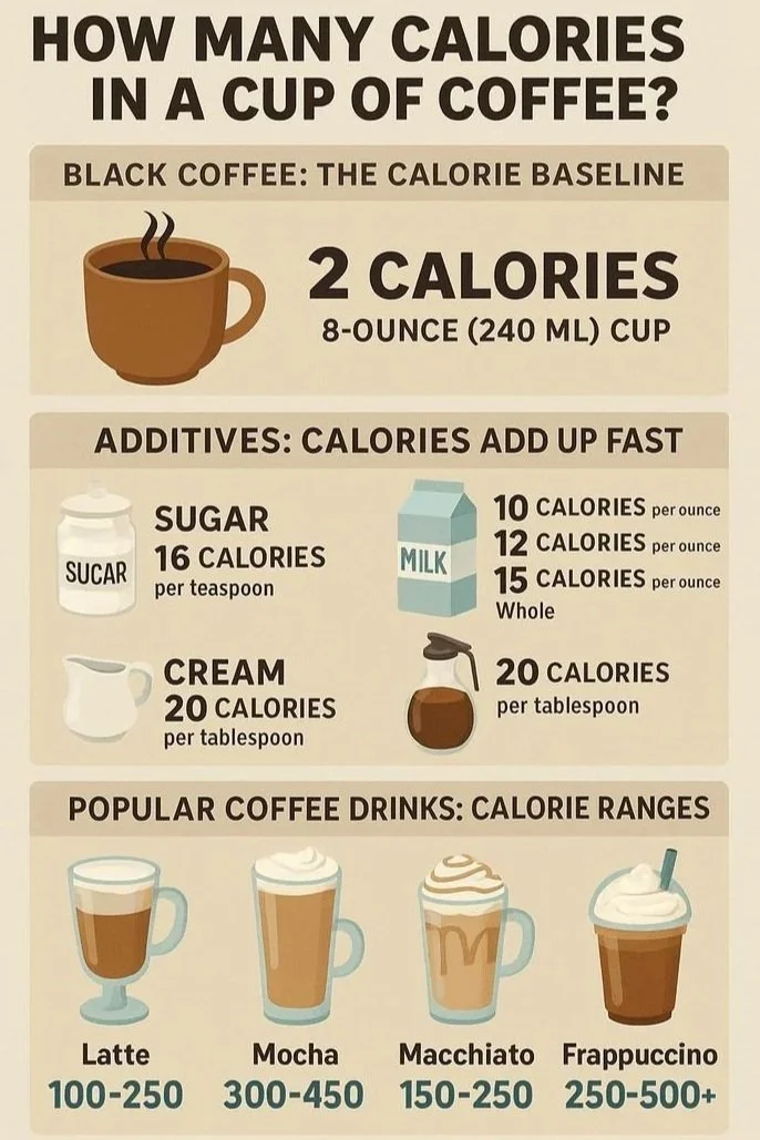 Un café noir, qu’il soit allongé, filtre ou americano, apporte en moyenne 2 à 5 kcal par tasse, tant qu’il n’y a pas d’ajout de sucre, sirop, lait, crème…