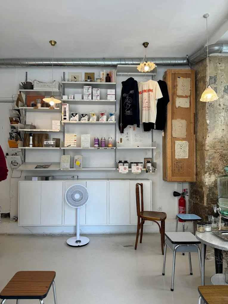 Une mini-boutique, entre tee-shirts, accessoires et dessins chinés pour parfaire le concept franco-coréen de ce coffee-shop pointu.